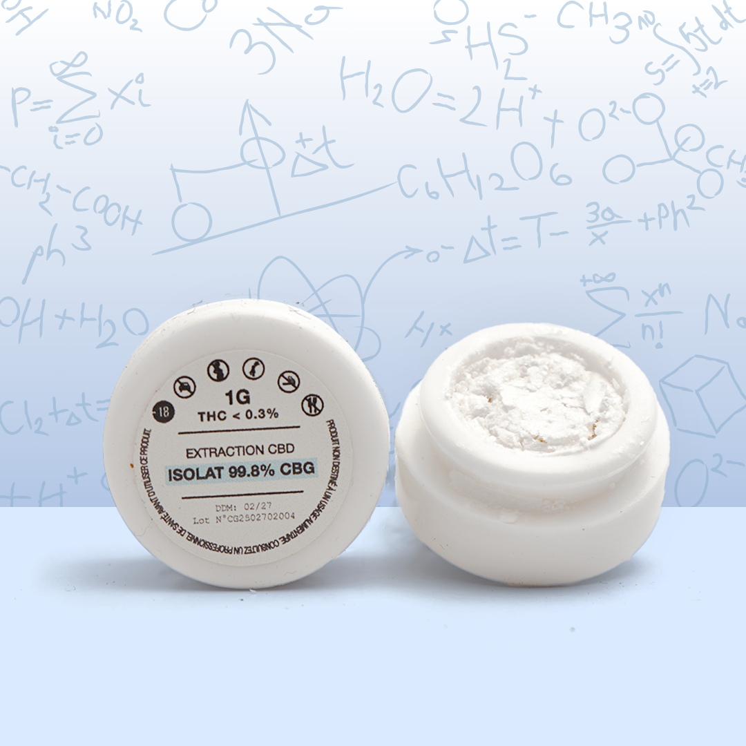 O nosso isolado de CBG é o resultado de uma extração técnica do cânhamo, cultivado segundo normas muito rigorosas. Obtém um produto de qualidade superior, isento de substâncias nocivas como pesticidas, metais pesados e solventes.